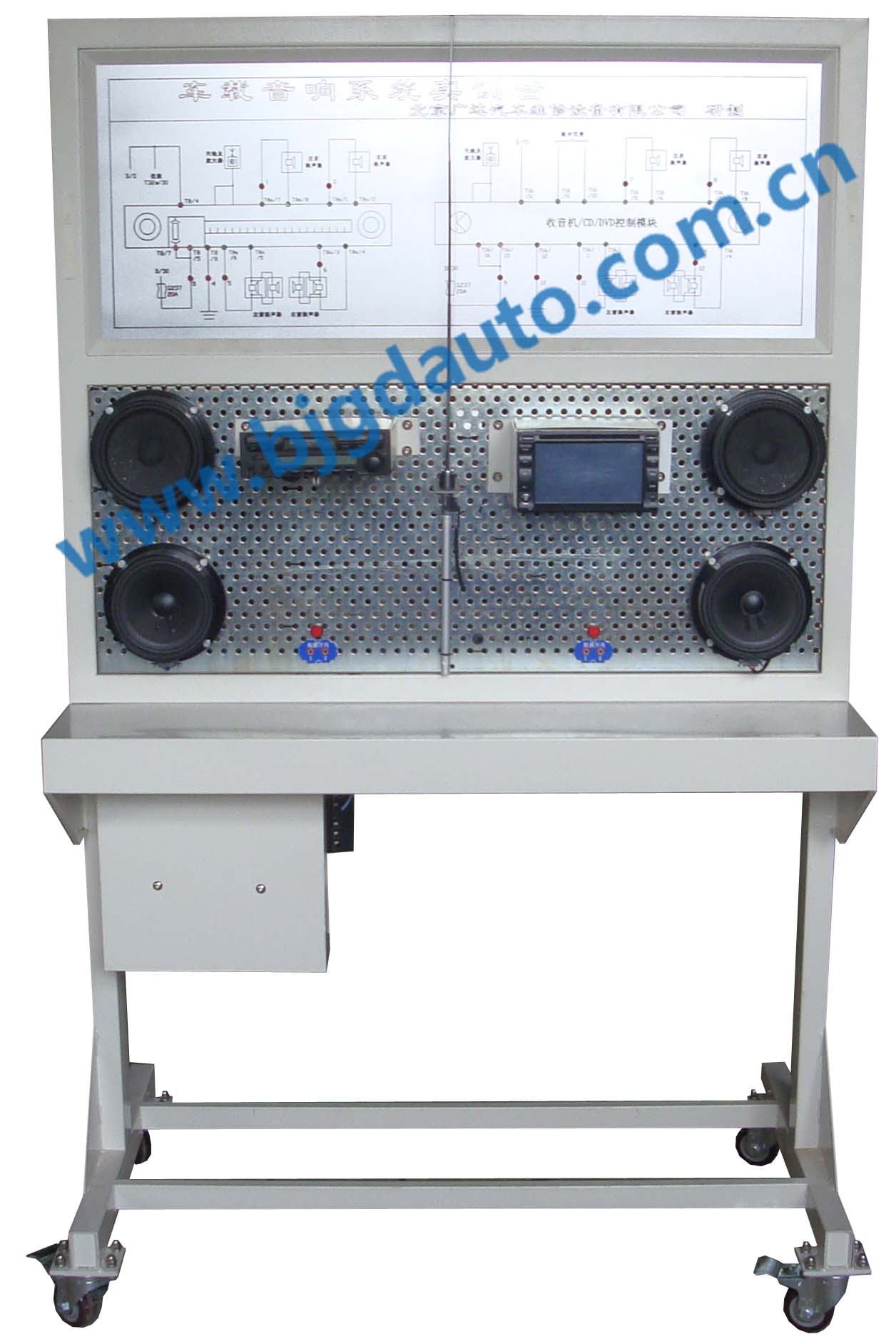 設備采用原車汽車音響、倒車雷達、GPS定位系統(tǒng)器件組成,包括:收音機/CD/DVD控制模塊、揚聲器、倒車攝像頭等。外加系統(tǒng)主要包括: 故障設置系統(tǒng)、故障顯示裝置、檢測端子以及安全防護裝置等。本臺架可以完整展示汽車音響、倒車雷達、GPS定位系統(tǒng)系統(tǒng)的組成、結構和工作原理,可以進行系統(tǒng)常見故障的模擬、診斷和檢測實操訓練,提高學生分析和解決實際問題的能力,適合中高等汽車院校與培訓機構對學員進行教學的需要。