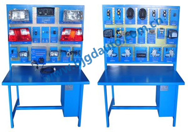 設備采用原車電器系統(tǒng)部件,包括:照明系統(tǒng)、儀表系統(tǒng)、信號系統(tǒng)、音響系統(tǒng)、玻璃清潔系統(tǒng)、中控門鎖、玻璃升降器、電動后視鏡、汽車喇叭、發(fā)動機電控系統(tǒng)等。各系統(tǒng)按功能劃分,制作為“舒適系統(tǒng)實訓臺”、“燈光信號系統(tǒng)實訓臺”、“發(fā)動機電控系統(tǒng)”三個臺架。“舒適系統(tǒng)實訓臺”包括20個模塊,“燈光信號系統(tǒng)實訓臺”包括17個模塊,“發(fā)動機電控系統(tǒng)實訓臺”包括27個模塊,臺架采用獨立模塊組合結(jié)構(gòu),輔助機件包括:組合掛板、組合機架、電源、彩色插接線等。