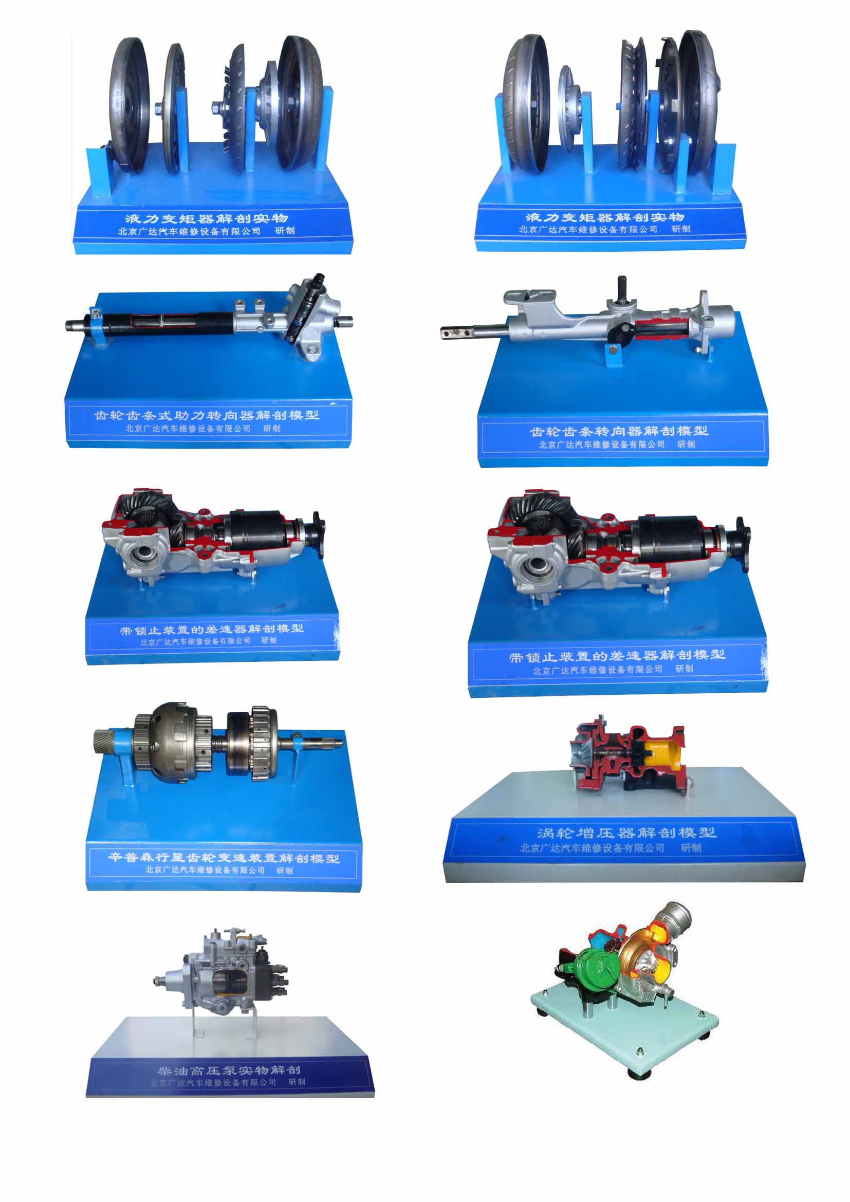 模型以汽車典型零配件實物為基礎(chǔ),有各種零部件解剖展示臺100多種,對各關(guān)鍵部分進(jìn)行充分剖切,剖面分層刷涂不同的顏色,可以清晰的反映出零部件的內(nèi)部結(jié)構(gòu),方便觀察設(shè)備的組成和運(yùn)行方式、理零部件的工作過程,掌握基本原理。解剖后的汽車典型零部件安裝在底座之上,便于擺放和展示。本產(chǎn)品適用于學(xué)校專業(yè)教室進(jìn)行理論教學(xué)和實訓(xùn)教學(xué)。